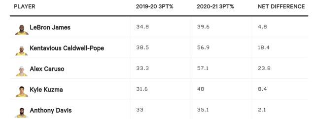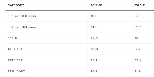 2019-20赛季,湖人每百回合三分出手31.1次,命中10.8球,而本赛季每百回合出手32.2次,命中12.9球,三分命中率也从34.9%提升到40%。他们投得更多,也投得更准了。