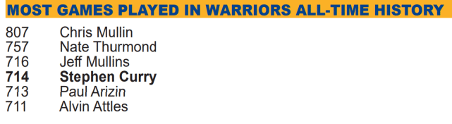 除了三分球,库里还有一项里程碑即将解锁。他已经为勇士出战714场常规赛,再打两场比赛,他就能追平杰夫-穆林斯,成为勇士队史上出场次数第三多的球员。队史前两位分别是克里斯-穆林(807场)和内特-瑟蒙德(757场)。现在,能够实现一人一队的球员越来越少,而库里很有可能成为其中之一。目前这份合同结束后,库里有望和勇士再次续约,为这支球队效力到退役。