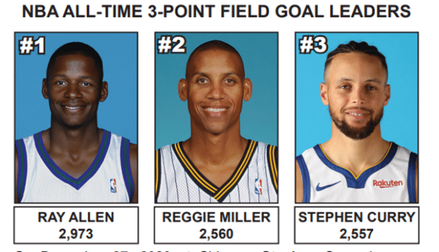 库里是一个用三分改变这项运动的球员,他投中2557个三分球,只用了714场比赛,而他即将超越的米勒,用了1389场比赛投中2560个三分球,榜首的阿伦用了1300场比赛投中2973个三分球。按目前的趋势,库里大概总计只需要用800多场比赛,就能成为NBA历史上的三分王了。