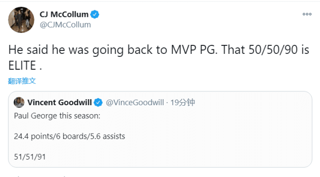 赛后有记者在社交媒体上晒出乔治本赛季的数据:24.4分6篮板5.6助攻,51/51/91!也就是说,乔治本赛季的投篮命中率和三分球命中率都在51%,而罚球命中率则高达91%!开拓者球员CJ麦科勒姆在社交媒体上转发了这一数据,并且写道:“他说他要回到那个竞争MVP赛季的乔治,50/50/90真是精英级别的表演。”