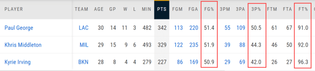 篮网刚刚复出的欧文,目前的数据也符合180俱乐部的要求。他的投篮命中率是50.9%,三分命中率42%,罚球命中率96.3%。篮网组成的三巨头,进攻端自然是无解的存在,首秀就合砍96分,但他们在防守端还得继续加强。杜兰特开季以来的状态也很好,目前他的投篮命中率是53.4%,三分命中率是46.6%,只是罚球还差一些,目前命中率是86.7%。