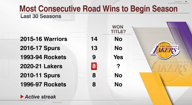 根据显示,最近30年来常规赛开局客场8连胜及以上的球队有6支,除了本赛季的湖人之外,只有1993-94赛季的火箭赢得了同一赛季的总冠军,当时他们是开局9连胜,最终在奥拉朱旺的带领下成功夺冠。