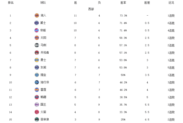 NBA最新排名!绿军湖人领跑,爵士6连胜反超快船,火箭倒数第二