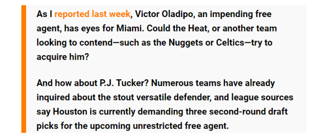 奥拉迪波能为火箭换回什么筹码?目前还不得而知,但火箭对于PJ-塔克的要价却已经被公开了。奥康纳表示,火箭目前为这位防守悍将开出的价码是三个次轮签,不得不说,这个要价还是比较高了,塔克虽然防守能力不错,但他毕竟已经快要36岁了。