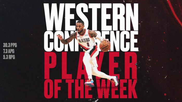 利拉德上周带领开拓者四战3胜1负,场均轰下30.3分5.3篮板7.3助攻,在这四场比赛中,利拉德带队击败国王轰下40分,击败老鹰又轰下36分;开拓者官方晒照为利拉德庆祝,并且写道:我们打断一下比赛,恭喜利拉德当选西部周最佳。