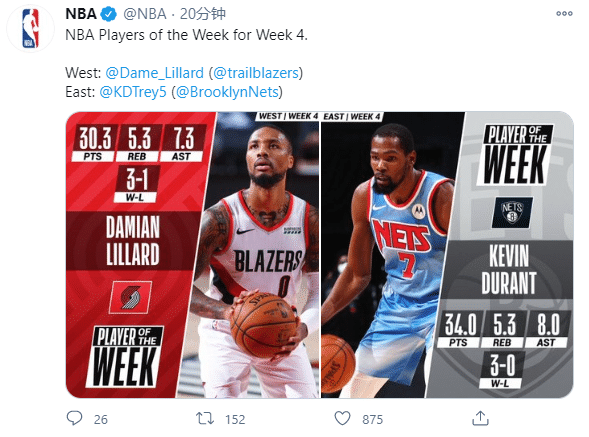 来源:24直播网01-19 10:5124直播网讯 北京时间1月19日,NBA官方公布常规赛第四周东西部周最佳球员,篮网巨星杜兰特和开拓者核心利拉德分别当选,两人都是场均狂砍30+5+5的数据,其中“死神”杜兰特的状态更加恐怖。
