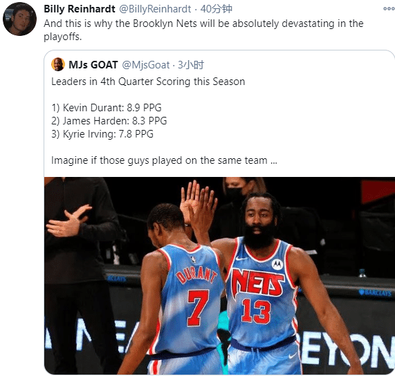 对于篮网三巨头如此恐怖的末节统治力,名记Billy Reinhardt发推写道:这就是布鲁克林篮网将会绝对毁灭季后赛的原因。