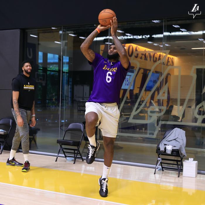 赛前训练时,36岁詹姆斯又是身穿湖人6号战袍,站在场外加练金鸡独立式超远三分球,当时浓眉就站在詹姆斯旁边,这两兄弟真是一刻也想分开。
