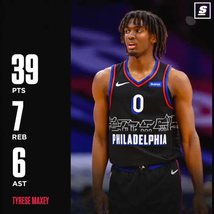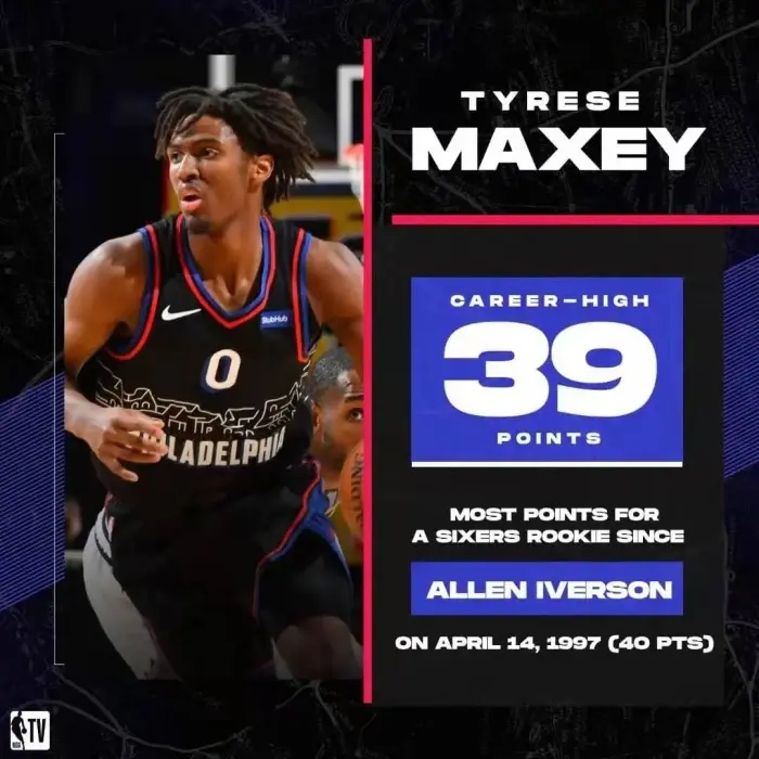 此外,39分也创造了本赛季新秀的单场得分新高,此前的纪录是状元爱德华兹面对开拓者所砍下的26分。并且马克西还成为队史自艾弗森之后,首位砍下至少35分的新秀,也是自艾弗森后单场得分最高的76人新秀。