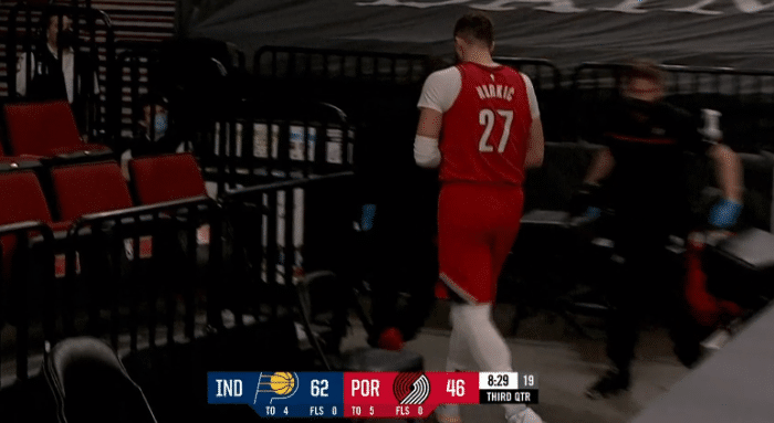 比赛打到第三节8分多钟,努尔基奇防守中不慎受伤,直接捂着手腕受伤返回更衣室,随后开拓者官宣努尔基奇右手腕骨折;本场比赛,努尔基奇首发出战20分钟8投2中、三分3中1贡献5分8篮板2助攻1盖帽还有2失误2犯规,正负值-7。