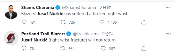 26岁努尔基奇太不幸,防守切球导致手腕骨折,本赛季他已经为开拓者首发出战11场比赛,场均贡献10.3分7.6篮板2.8助攻还有1抢断0.9盖帽,是开拓者主力内线球员;不算本场比赛,开拓者7胜4负排名西部第四,努尔基奇的功劳不小,可惜他又受伤了。