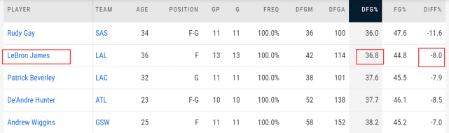 这一数据,在评选最佳防守球员时,有一定的参考性。2019-20赛季,夺得最佳防守球员奖项的字母哥,让对手的命中率只有36.2%,排名联盟第一,而排名第二的就是湖人的浓眉,他对位防守下对手的命中率是38.3%。他们俩也是165位球员里仅有的两位将对方命中率限制在40%以下的球员。