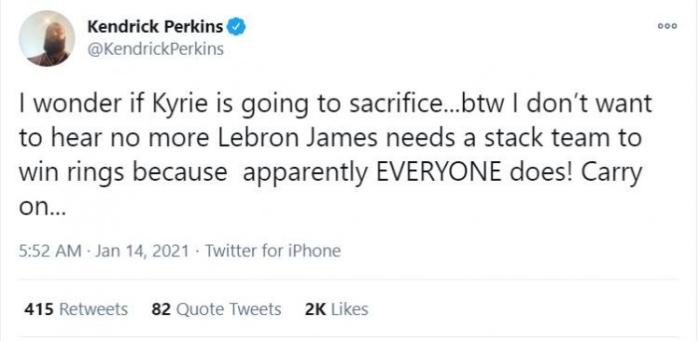 这是个球星的联盟,没有球星无法夺冠,组建三巨头缴纳奢侈税是必须的,这也是哈登对火箭失望的原因。帕金斯发推为詹姆斯鸣不平“我想知道是否欧文将会牺牲……但我不想听到再多的说詹姆斯需要超级球星才能夺冠的话了,因为显然每个人都需要!”