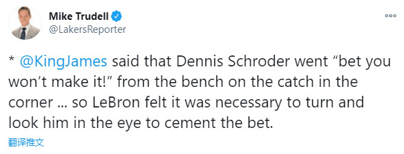 詹姆斯表示施罗德打赌他投不进这样的三分球,所以詹姆斯在底角出手三分后直接转身,目的就是和施罗德再确认一下赌约;詹姆斯告诉记者:我投出这个球,我就立马转向替补席,看着施罗德的眼睛,并对他说:赌不赌?