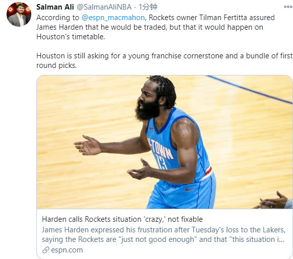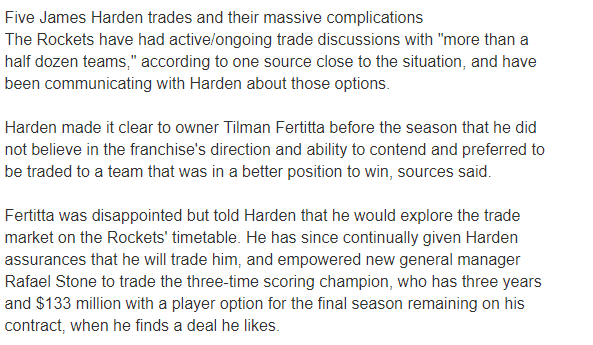 火箭已经与超过六支球队进行了积极持续的交易谈判,并且就此一直和哈登保持沟通;由于火箭队明确索要一位年轻球队基石和大量选秀权,关于哈登的交易一直没有谈拢。