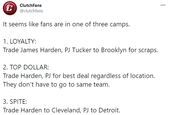 哈登想要离队,火箭也愿意把他交易出去,无奈火箭要价太高,哈登一直没有如愿离队;对于火箭目前的情况,火箭队相关美媒出球迷仇恨哈登三大阵营的想法:把哈登和PJ-塔克交易到篮网、无论哪队,不要把哈登和塔克交易到同一支球队,把哈登交易到骑士,塔克交易到活塞。