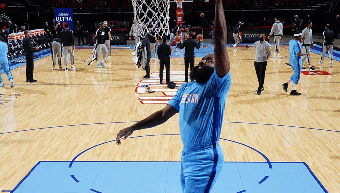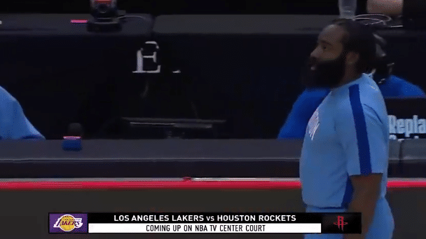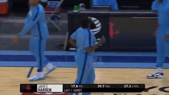 这是赛前热身的环节,解说员看到了哈登臃肿的身材,调侃到:“哈登一定是赛前吃了一顿才来参加比赛的。”