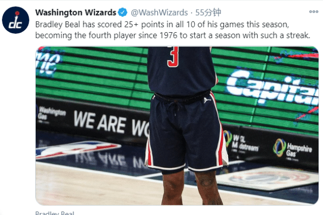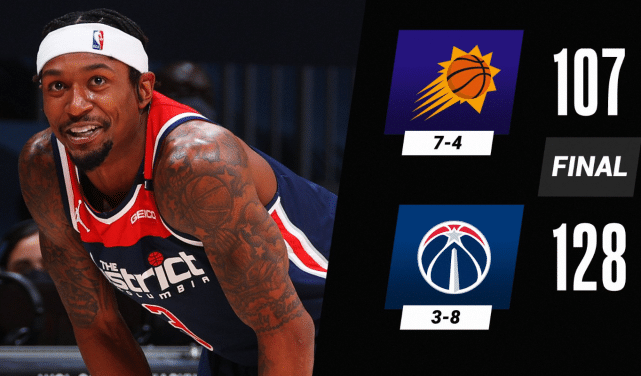 在这场对阵太阳的比赛中,比尔在第一节和第三节分别轰下了13分和17分。在威少缺阵的情况下,比尔承担了球队大部分的球权。他不但展示了自己的得分能力,全场比赛9次助攻1次失误,也证明了自己的全面性。加上队友贝尔坦斯第二节连中5记三分的疯狂表现,奇才最终爆冷大胜。