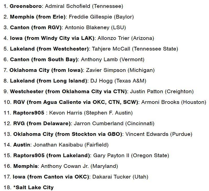 本次选秀大会中阿德米拉尔-斯科菲尔德(Admiral Schofield)第一个被选中,前年的NBA选秀大会中,第二轮第42顺位被费城76人队选中,之后他辗转奇才和雷霆后被裁掉,这次他将征战发展联盟。