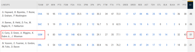 在联盟所有的5人组里,这个累计输分是第三差的,仅次于黄蜂的海沃德+比永博+罗齐尔+格拉汉姆+华盛顿(净负48分)和国王的巴恩斯+希尔德+福克斯+巴格利+哈利伯顿(净负36分)。