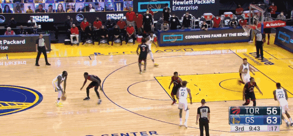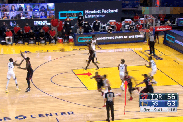 比赛进行到第三节初,猛龙在一次防守过程中,当时勇士63-56领先。上半场在猛龙的严防死守之下,库里只有开场投进1球,随后便开始疯狂的打铁模式。但即便如此,猛龙也 丝毫没有放松对于库里的防守。这一个回合,格林弧顶持球,库里从一侧沿三秒区做了一个绕切战术,佯装要在右侧45度接球。结果,猛龙两名防守球员迅速跟上,而鲍威尔也想跟上去防库里,此时篮下完全真空。维金斯顺势切入禁区,格林直塞篮下,维金斯轻松扣篮。此时,边上的乌布雷都懵了 ,转头看了看,好像在说:兄弟,你们干啥呢?
