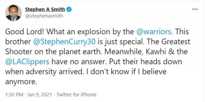 著名解说员A-史密斯点评该场比赛说道,勇士“炸弹级”的表现,而小卡和快船面对敌人低下了头。