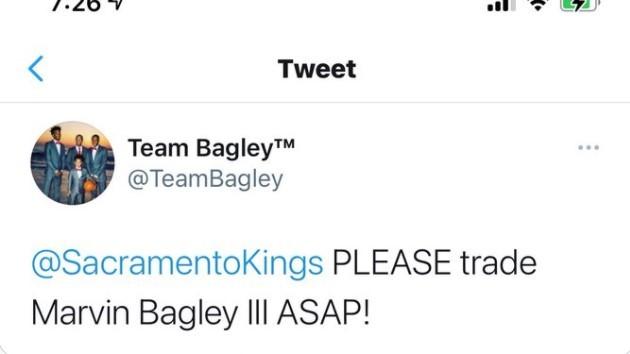北京时间2021年1月03号,国王94-102不敌火箭后,毫无征兆情况下,球队前锋巴格利父亲运营的账号发推写道:“@国王,请你们尽快交易马文-巴格利!”