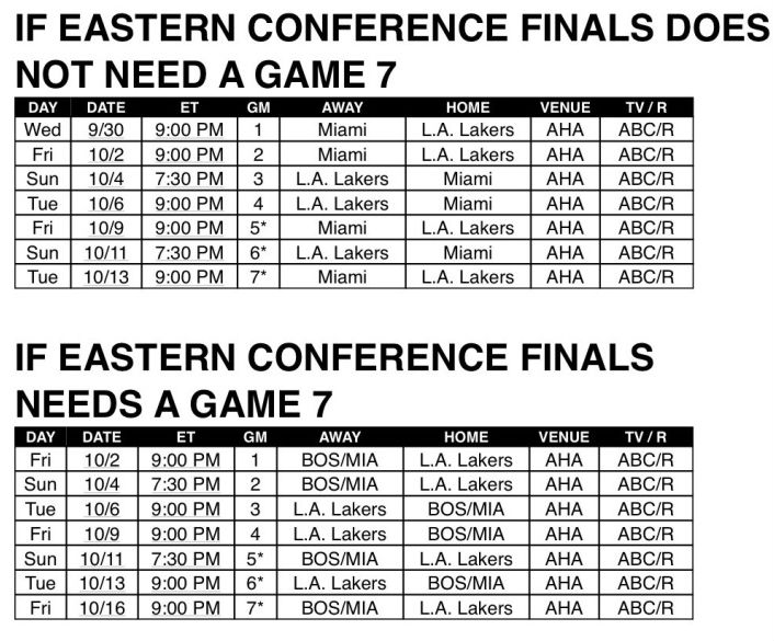 若热火和凯尔特人之间的东部决赛进行到第七场,则总决赛首场会在北京时间10月3日9:00开启,后续比赛将会分别在10月5日7:30、10月7日9:00、10月10日9:00、10月12日7:30、10月14日9:00、10月17日9:00进行(后三场如有必要)。
