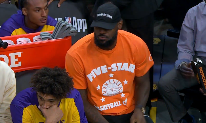 湖人客场对阵太阳,詹姆斯轮休不打,雷迪克调侃:他被DNP了,原因是太老,我从波波维奇那里学的;老詹身穿橙色T恤、戴着黑色棒球帽坐在替补席观战,首节浓眉疯狂命中三分球时,老詹站起来为浓眉庆祝。