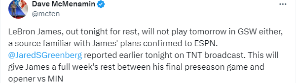 美记Jared Greenberg表示:正如我在TNT报道的那样,詹姆斯的季前赛已经结束了;他今晚不会上场,明天也不会出战对阵勇士的比赛。湖人正在打持久战,以确保詹姆斯为下周三进行的生涯第22个赛季的揭幕战做好充分准备。