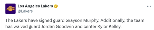 墨菲将身穿湖人40号球衣,今日季前赛收官战湖人将对阵勇士。