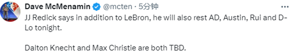 雷迪克表示,除了詹姆斯,他还计划让浓眉、里夫斯、拉塞尔、八村垒等人轮休,克内克特和克里斯蒂的出战状态将在赛前决定。