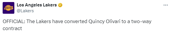 23岁的昆西-奥利瓦里是今年的落选秀,来自泽维尔大学,身高1米91司职后卫,通过在季前赛的出色表现,赢得了一份双向合同,进入湖人队15+3大名单。