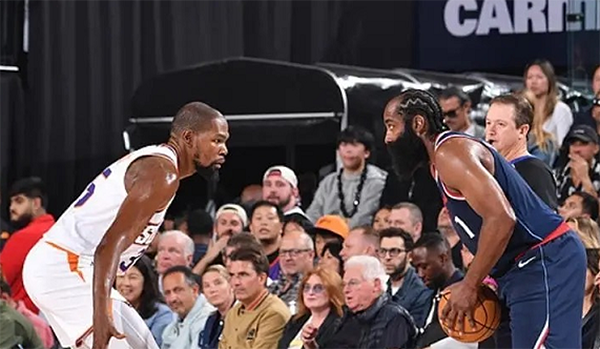 首节初期,双方展开鏖战,比分差距并未被拉开,第一节结束时,太阳领先1分。第二节,太阳在杜兰特、布克和比尔的带领下,扩大优势,上半场领先快船8分。第三节,被动之下的快船爆发,哈登扛起球队,率队单节净胜10分,快船带着2分的优势进入到第四节。末节的决战,杜兰特的两罚全丢,引发现场快船球迷们的欢呼。太阳的球员们失误偏多,鲍尔默很开心,快船一度领先两位数。杜兰特命中关键球,哈登压哨上篮没进,双方103平,进入到加时赛。加时赛,哈登致命失误,太阳拿下胜利。