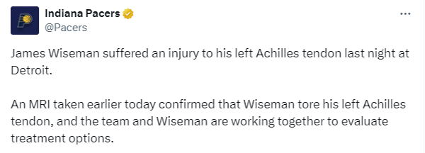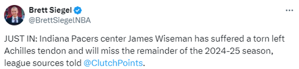 随后名记Brett Siegel报道,怀斯曼因左跟腱撕裂将会缺席2024-25赛季的剩余比赛,换言之,怀斯曼因伤提前赛季报销,成为本赛季第一位报销的球员。