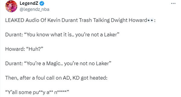 坐在底线的霍华德对杜兰特喷垃圾话,杜兰特说:你懂得是啥意思;霍华德:我知道是啥意思,你懂我知道啥意思;杜兰特连续强调:你不是湖人队球员,你是魔术球员;霍华德:我是“魔术师”;杜兰特:他们把你坑惨了。