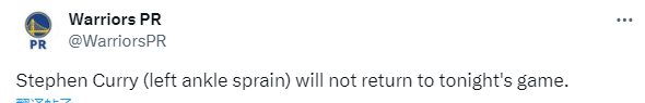 第三节库里意外崴脚并且一瘸一拐下场坐回替补席,接受治疗,这一次扭伤,库里的伤势无大碍,可末节库里上场后又崴脚,这一次库里十分痛苦,一瘸一拐直接离场返回更衣室,希望库里的伤势别太严重。