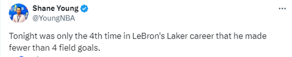 这是詹姆斯职业生涯第4次单场投篮命中数低于4球。