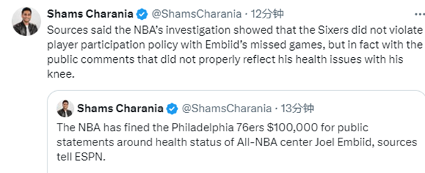 据ESPN名记Shams报道,费城76人队因公开声明恩比德的健康情况,被罚款10万美元;Shams后续跟进报道,NBA的调查显示,76人并没有因为恩比德缺席比赛而违反球员的参赛政策,事实上,他们的公开声明并没有正确反映恩比德的健康问题。