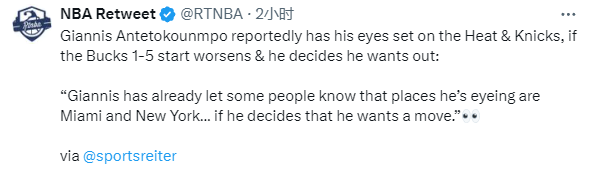 今日美媒NBA Retweet报道,字母哥已经让一些人知道,如果他决定申请离队,他把目光瞄准了迈阿密热火和纽约尼克斯。
