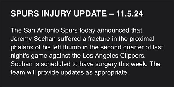来源:24直播网11-06 17:2124直播网讯北京时间11月6日,波波维奇因遭遇健康问题而无限期休养,马刺主帅生病后又有坏消息,马刺官方宣布,索汉遭遇了左手大拇指骨折,计划本周接受手术,索汉是在昨天对快船比赛的第二节中受伤的,球队将在未来适时更新索汉的伤情。