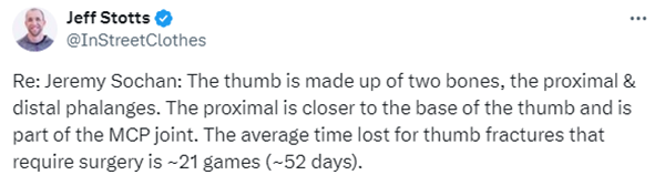 昨天马刺在领先26分的情况下被快船逆转,不仅输球还折损一员大将,根据ChatGPT的统计,索汉大拇指骨折的康复时间通常是6到8周左右;对于索汉的伤情,医学专家Jeff Stotts表示接受拇指手术的球员平均缺席21场比赛(约52天)。