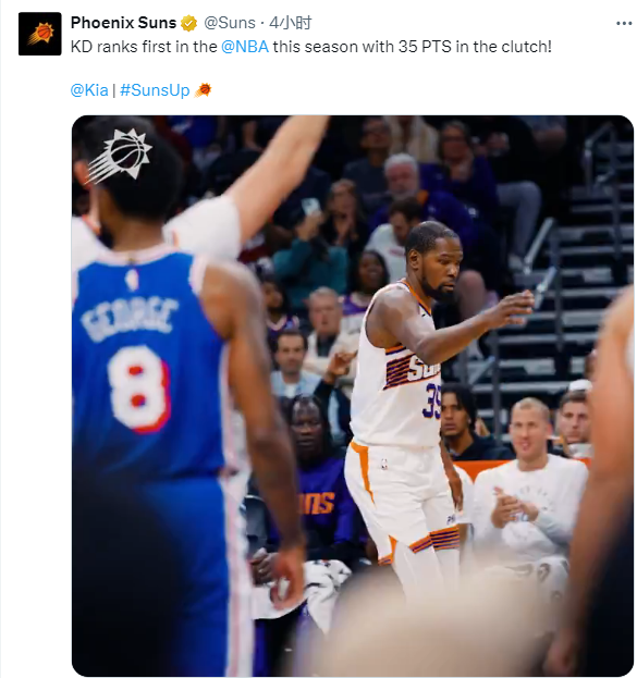 赛季至今,比赛打到关键时刻时,太阳队的战绩为7胜0负,太阳总是能够赢下关键比赛的大功臣就是杜兰特;本赛季,杜兰特已经在关键时刻拿到35分,如此数据位居联盟第一;前NBA球员钱德勒-帕森斯盛赞杜兰特:杜兰特在他效力的每一支球队都是最好的球员。