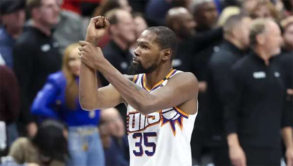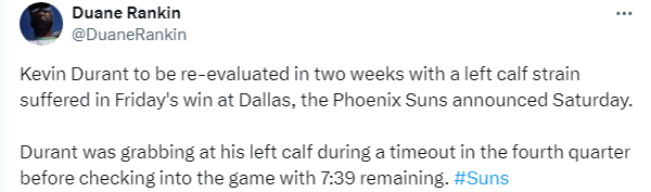杜兰特因小腿拉伤至少休战两周,未来两周,太阳将两战国王、对阵爵士、雷霆、森林狼、魔术和尼克斯,杜兰特都因伤无法出战,而且目前不知道KD何时能够回归。