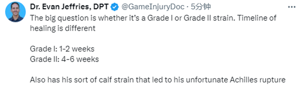 对于杜兰特的伤情,医学专家Evan Jeffries表示,现在最大的问题是杜兰特受伤的严重程度,若小腿一级拉伤,休战1-2周;若二级拉伤,就要休战4-6周。