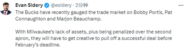 据ESPN记者Brian Windhorst报道,雄鹿已经向其他球队发送交易请求,但不包括利拉德和字母哥;名记Evan Sidery报道,近日雄鹿对波蒂斯、康诺顿和比彻姆的交易市场进行了评估,由于雄鹿缺乏资产而且球队薪资很高,他们必须发挥创造力才能在明年2月份交易截止日前达成交易。