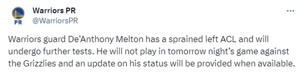 勇士梅尔顿受伤迷雾:左膝韧带扭伤,复出无期,却带伤打完比赛?