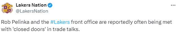 不过美媒《Lakers Nation》记者Ron Gutterman报道,湖人在交易谈判中吃了闭门羹,该记者透露:戴维斯是湖人目前阵中除了双向球员科洛科以外,唯一健康的中锋。海斯和伍德都因伤缺阵,给戴维斯留下了沉重的负担。然而,情况并没有得到帮助,湖人在试图与其他球队进行交易谈判时屡屡碰壁。