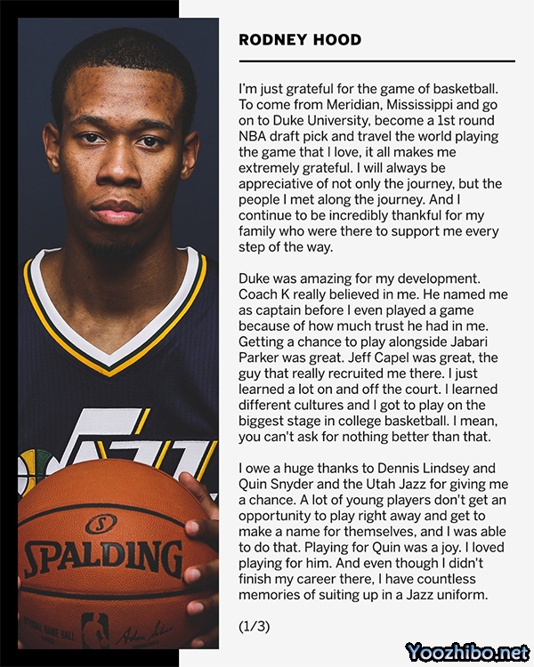 我特别感谢丹尼斯-林赛、奎因-斯奈德以及犹他爵士队,他们给了我机会。很多年轻球员没有机会马上上场打球并展现自己,而我得到了这个机会。为奎因打球是一种享受,我非常喜欢在他的手下效力。尽管我的职业生涯没有在爵士结束,但身穿爵士球衣的无数记忆将永远伴随我。”