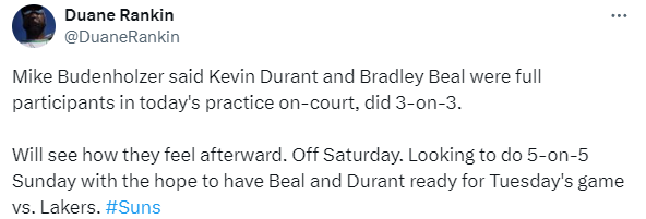 今日太阳主帅布登霍尔泽在训练后透露杜兰特和比尔的情况,布登表示,杜兰特和比尔在今天强度较轻的训练中全程参与,还进行了一些三对三的对抗练习;布登还表示:我们希望、也计划着他们能在下周一进行一些五对五的对抗练习,然后继续推进恢复进程,希望他们能在下周三对阵湖人的比赛中登场。